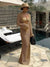 O decote profundo em V valoriza o colo, enquanto as mangas longas e o caimento ajustado equilibram sensualidade e sofisticação. O tom terroso traz naturalidade à peça e remete ao estilo mediterrâneo, ideal para destinos de praia, resorts e viagens tropicais.