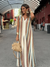 Com modelagem longa e sem mangas, o vestido conta com fenda frontal discreta que garante movimento e frescor ao caminhar. O decote em V alonga a silhueta e confere um toque feminino e moderno. Ideal para usar em passeios de verão, viagens à praia ou eventos ao ar livre.
